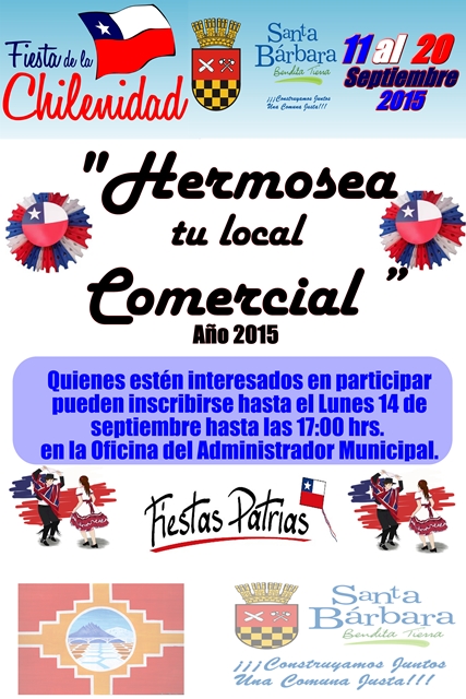 En la celebraciones de Fiestas Patrias año 2015, su alcalde de la Municipalidad de Santa Bárbara, Daniel Salamanca Pérez, invita a todos los comerciantes y microempresarios de Santa Bárbara a participar del Concurso “Hermosea tu local Comercial,”. Esto, con el propósito de incentivar la ornamentación y decoración en los establecimientos comerciales, generando un ambiente de celebración en estas fiestas patrias, además de incentivar la participación de los microempresarios y comerciantes en las celebraciones típicas de nuestra comuna, aportando al desarrollo turístico de este.